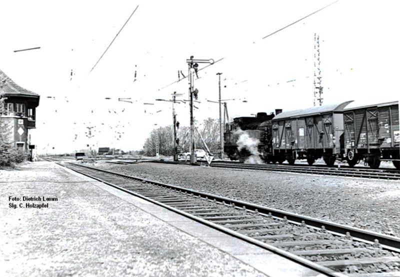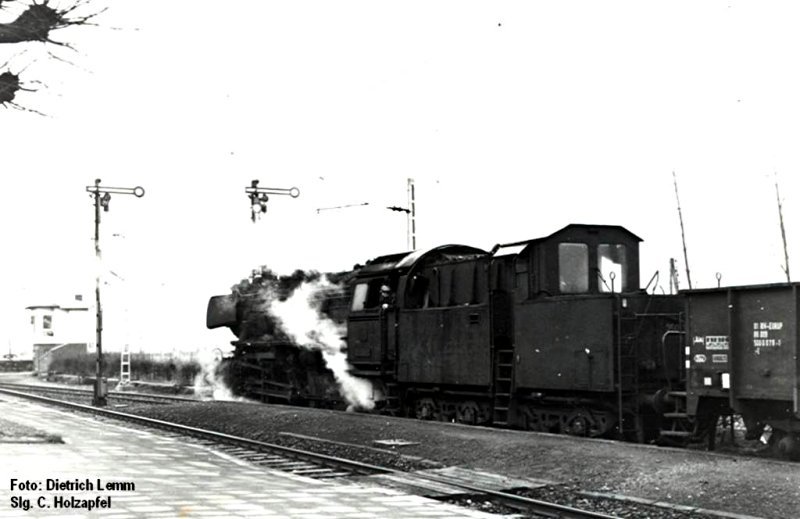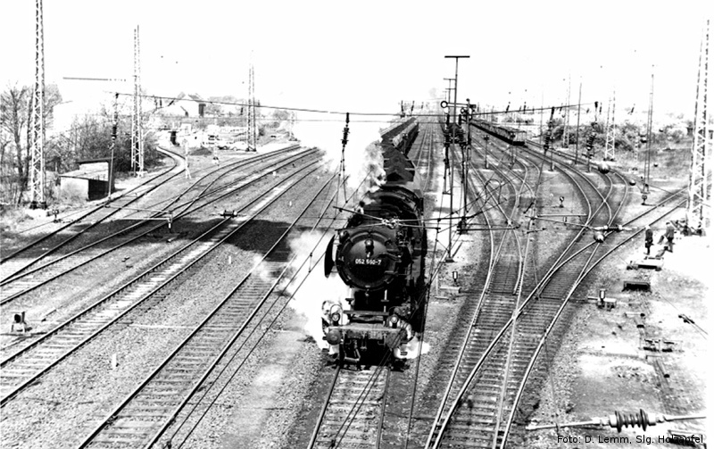 Eine Dampflok der Baureihe 52 verlässt mit einem langen Kohlenzug Rheinkamp